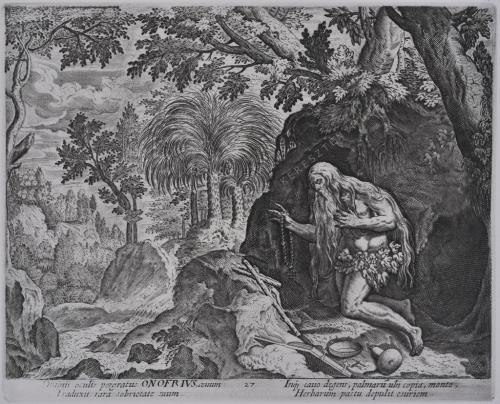Diuinis oculis pergratus ONOFRIVS, aeuum Traduxit rara sobrietate suum. Inque cauo degens, palmaru(m) ubi copia, monte, Herbarum pastu depulit esuriem.