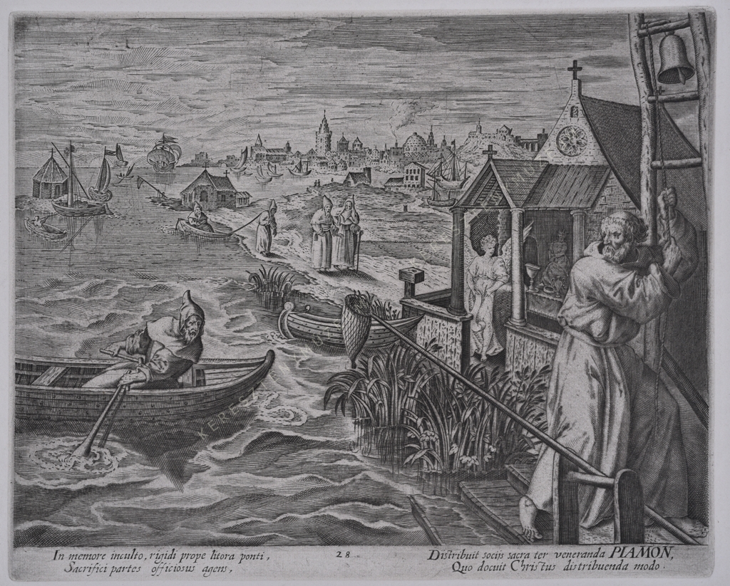 In memore inculto, rigidi prope litora ponti, Sacrifici partes officiosus agens, Distribuit socijs sacra ter veneranda PIAMON, Quo docuit Christus distribuenda modo.