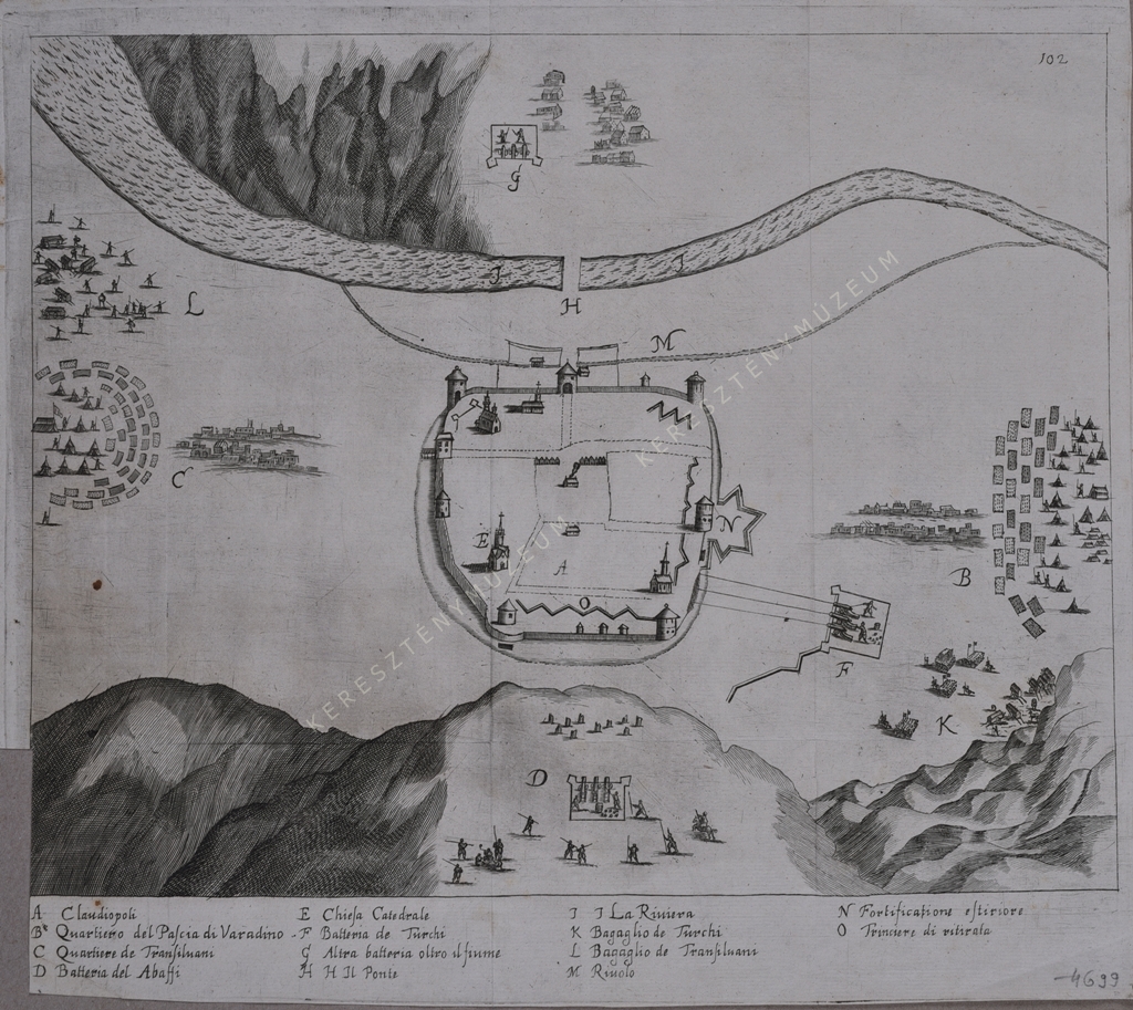 A. Claudiopoli. B. Quartiero del Pascia di Varadino. C. Quartiere de Transiuani. D. Batteria del Abaffi. E. Chiesa Cattedrale. F. Batteria de Turchi. G. Altra batteria oltro il fiume. H. H Il Ponte. I. I La Riuiera. K. Bagaglio de Turchi. L. Bagaglio de Transiluani. M. Riuolo. N. Fortificatione estiriore. O. Trinciere di ritirata.