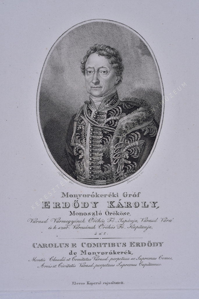 Monoszló Örököse, Varasd Vármegyének Örökös Fő_Ispánja, Várasd Vára' és k.szab. Városának Örökös Fő_Kapitanja, 's a' t. / CAROLUS E COMITIBUS ERDŐDY de Monyorókerék, Montis Claudii et Comitatus Varasd perpetuus ac Supremus Comes, Arcis et Civitatis Varasd. perpetuus Supremus Capitaneus.