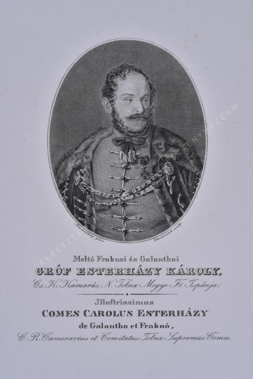 Cs. K. Kamarás, N. Tolna Megye Fő-Ispánja. / Illustrissimus cOMES CAROLUS ESTERHÁZY de Galantha et Fraknó, C. R. Camerarius et Comitatus Tolna Supremus Comes.