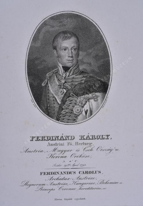 Austriai Fő_Hertzeg, Austria, Magyar és Cseh Ország &c Korona Örököse, 's a' t. Szület. 19.dik April. 1793. / FERDINANDUS CAROLUS, Archidux Austriae, Regnorum Austriae, Hungariae, Bohemiae &c Princeps Coronae hereditarius, cet.