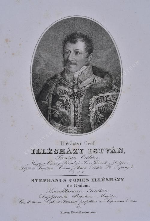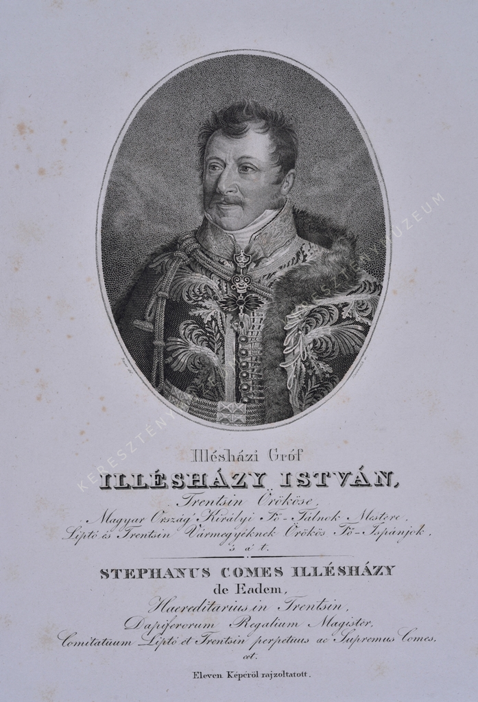 Trentsin Örököse, Magyar Ország' Királyi Fő_Tálnok Mestere, Liptó és Trentsin Vármegyéknek Örökös Fő_Ispánjok, 's a' t. / STEPHANUS COMES ILLÉSHÁZY de Eadem, Haereditarius in Trentsin, Dapiferorum Regalium Magister, Comitatum Liptó et Trentsin perpetuus ac Supremus Comes, cet.