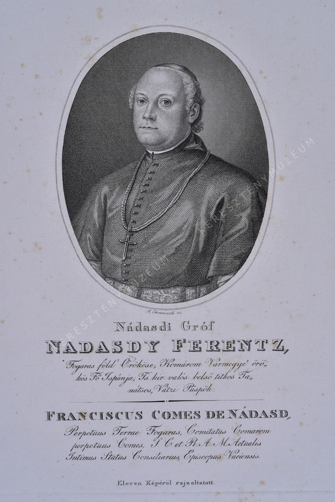 Fogaras föld' Örököse, Komárom vármegye' örökös Fő Ispánja, Ts. kir. valós: belső titkos Tanátsos, Vátzi Püspök. / FRANCISCUS COMES DE NÁDASD Perpetuus Terrae Fogaras, Comitatus Comarom perpetuus Comes, S. C. et R. A. M. Actualis Intimus Status Consiliarius, Episcopus Vaciensis.