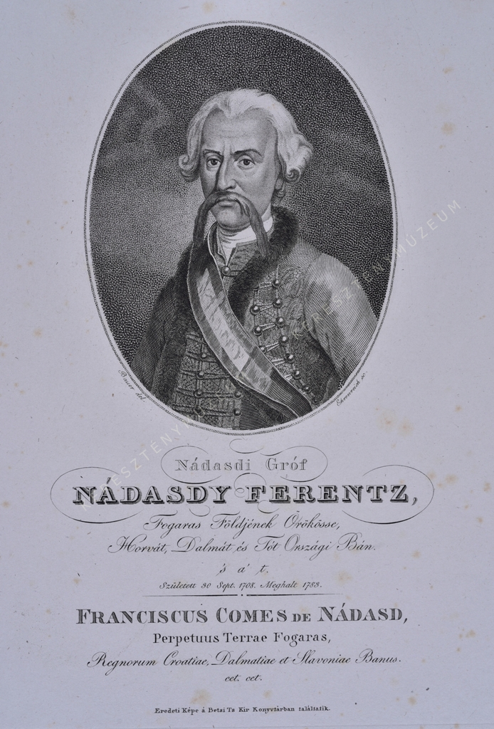 Fogaras Földjének Örökösse, Horvát, Dalmát és Tót Országi Bán, 's a' t. Született 30 Sept. 1708. Meghalt 1788. / FRANCISCUS COMES DE NÁDASD, Perpetuus Terrae Fogaras, Regnorum Croatiae, Dalmatiae et Slavoniae Banus cet.cet.