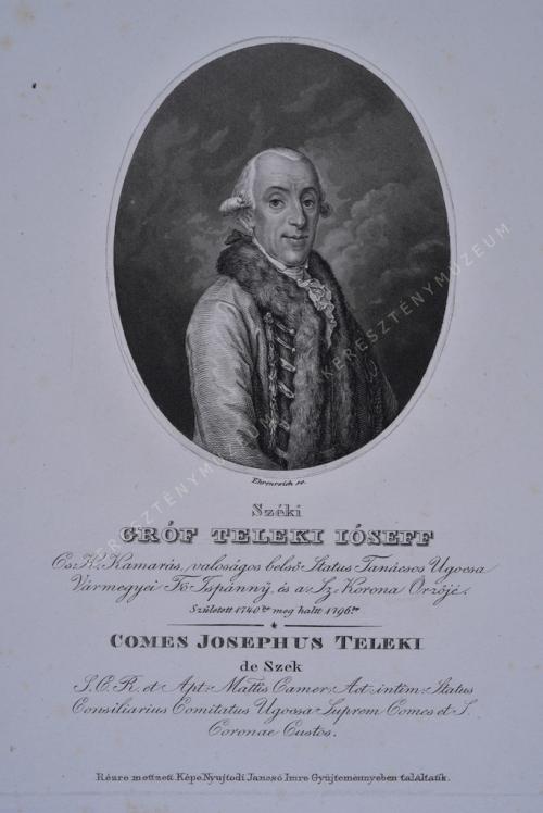 Cs. K. Kamarás, valoságos belső Status Tanácsos Ugocsa Vármegyei Fö Ispánny és a Sz. Korona Őrzője. Született 1740be meg haltt 1796ba. / COMES JOSEPHUS TELEKI de Szek S.C.R. et Apt: Mattis. Camer: Act: intim: Status Consiliarius Comitatus Ugocsa Suprem Comes et S. Coronae Custos. A lap alján: Rézre mettzett képe Nyujtodi Jancsó Imre Gyüjteménnyeben találtatik.