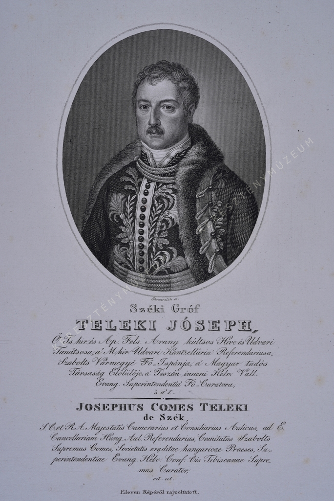 Ő Ts. Kir. És Ap. Fels. Arany Kúltsos Hive és Udvari Tanátsosa, a' M. kir. Udvari Kantzellária' Referendariusa, Szabolts Vármegye' Fő_Ispánja, a' Magyar tudós Társaság Előlülője, a' Tiszán inneni Helv. Vall. Evang. Superintendentia' Fő-Curatora, 's a' t. / JOSEPHUS COMES TELEKI de Szék, S. C. et R. A. Majestatis Camerarius et Consiliarius Aulicus, ad E. Cancellariam Hung. Aul. Referendarius, Comitatus Szabolts Supremus Comes, Societatis eruditae hungaricae Praeses, Superintendentiae Evang. Helv. Conf. Cis Tibiscanae Supremus Curator, cet.cet.