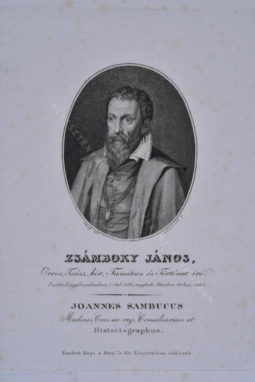 Orvos, Tsász. kir. Tanátsos és Történet iró. Szület. Nagy Szombatban 1. Jul. 1531, meghalt Bétsben 13. Jun. 1584. / JOANNES SAMBUCUS Medicus, Caes. ac reg. Consiliarius et HISTORIOGRAPHUS.