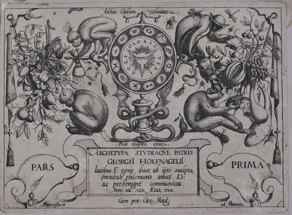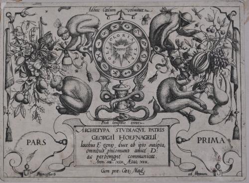 ARCHETYPA STUDIAQUE PATRIS GEORGII HOEFNAGELII Iacobus F. genio duce ab ipso scalpta omnibus philomusis amice D: ac perbenigne communicat. Ann: sal: XCII. Aetat.XVII.