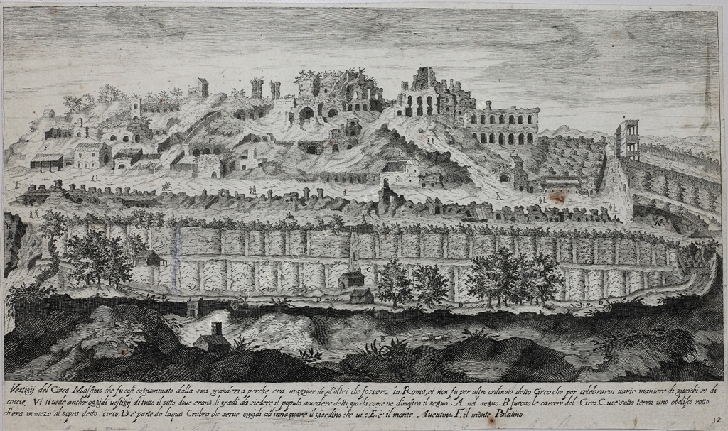 Vestigij del Circo Massimo che fu cosi cognominato dalla sua grandezza perche era maggiore de gl'altri che fossero in Roma, et non fu per altro ordinato detto Circo che per celebrarui uarie maniere di giuochi et di caccie. Vi si uede anchor oggidi uestigij di tutto il sitto doue erano li gradi da siedere il populo a uedere detti giochi come ne dimostra il segno. A. nel segno B. furono le carcere del Circo. C. uie sotto terra uno obelisco rotto ch'era in mezo sopra detto circo. D. e' parte de laqua Crabra che serue oggidi ad' innaquare il giardino che ui e' E. e' il monte. Auentino F. il monte Palatino.