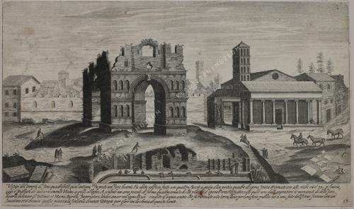 Vestigi del tempio di Jano quadrifro(n)te, qual antiam(en)te fu posto nel foro boario, Fu detto edificio fatto con quattro faccie a guisa d'un portico quadro di opra Jonica et ornato con 48 nicbi, cioè 12 p(er) faccia, oggi è spogliato de suoi ornamenti Vicino a quello al segno A. si uede un arco piccolo di forma quadra ornato di otto pilastri d'opera Corinthia, fu dirizzato quest'arco dalli argentieri et mercanti di detto foro boario in honore Settimio et Marco Aurelio Imperatori, Vedesi ancor nel segno B un condotto d'acqua antico che fu ritrouato sotto terra, doue per beneficio publico iui si sono fatte bellissime fontane con un lauatore et si chiama quella piazza la fontana di santo Giorgio per esser iui la chiesa di questo Santo.