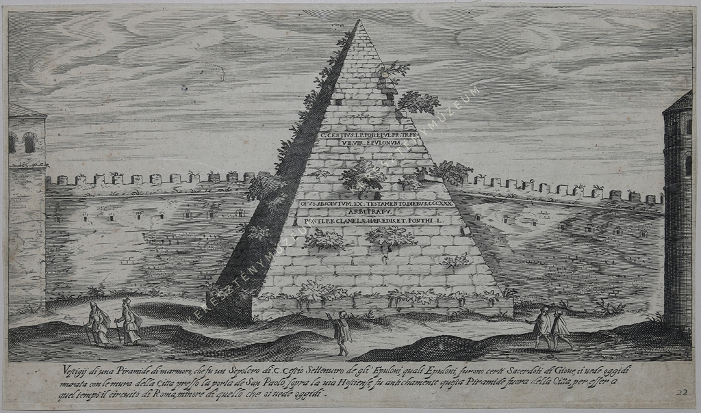Vestigij di una Piramide di marmoro, che fu un Sepolcro di C. Cestio Settenuiro de gli' Epuloni, quali Epuloni, furono certi Sacerdoti di Gioue, si uede oggidi murata con le mura della Citta presso la porta de San Paolo, sopra la uia Hostiense, fu antichamente questa Piramide fuora della Citta, per esser a quel tempo il circuito di Roma, minore di quello che si uede oggidi.