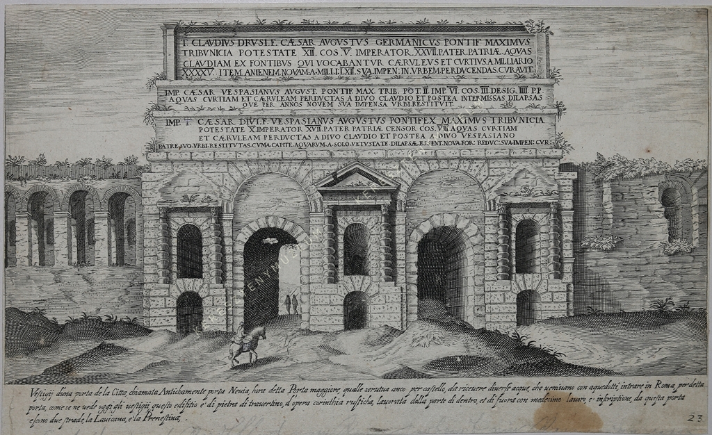 Vestigij d'una parte de la Citta, chiamata Antichamente porta Neuia, hora detta Porta maggiore, qualle serutua anco per castello, da riceuere diuerse acque, che ueniuano con aquedotti, intrare in Roma, per detta porta, come se ne uede oggi gli uestigii, questo edifitio e' di pietra di trauertino, d'opera corinthia