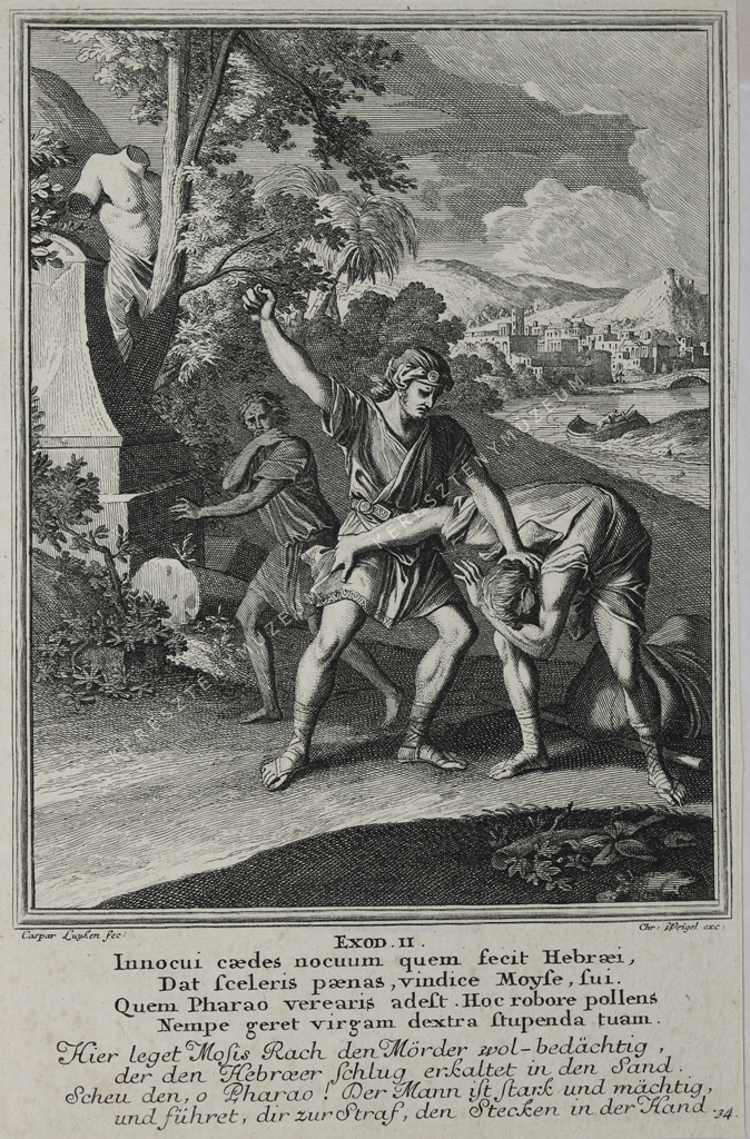 EXOD. II. Innocui caedes nocuum quem fecit Hebraei, / Dat sceleris paenas, vindice Moyse, sui. / Quem Pharao verearis adest. Hoc robore pollens / Nempe geret virgam dextra stupenda tuam. // Hier leget Mosis Rach den mörder wol-bedächtig, / der den Hebraeer schlug arkaltet in den Sand. / Scheu den, o Pharao! der Mann ist Stark und mächtig, / und führet, dir zur Straf, den Stecken in der Hand.