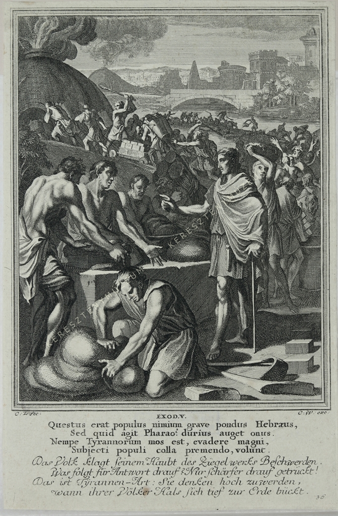 EXOD. V. Questus erat populus nimium grave pondus Hebraeus, / Sed quid agit Pharao? Durius auget onus. / Nempe Tyrannorum mos est, evadere magni, / Subjecti populi colla premendo, volunt. // Das Volk klagt seinem Haubt des Ziegelwerks Beschwerden. / Was folgt für Antwort drauf? Nur schärfer drauf getrückt? / Das ist Tyrannen-Art: Sie denken hoch zu werden, / wann ihrer Völker Hals sich tief zur Erde bückt.