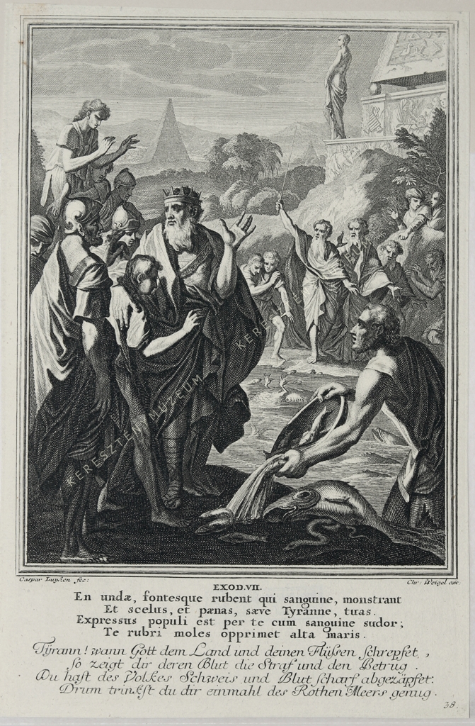 EXOD. VII. En undae, fontesque rubent qui sanguine, monstrant / Et scelus, et paenas, saeve Tyranne tuas. / Expressus populi est per te cum sanguine sudor; / Te rubri moles opprimet alta maris. // Tyrann! Wann Gott dem Land und deinen Flüssen schrepfet, / so zeigt dir deren Blut die Straf und den Betrug. / Du hast des Volkes Schweis und Blut scharf abgezäpfet / Drum trinkst du dir einmahl des Rothen Meers genug.
