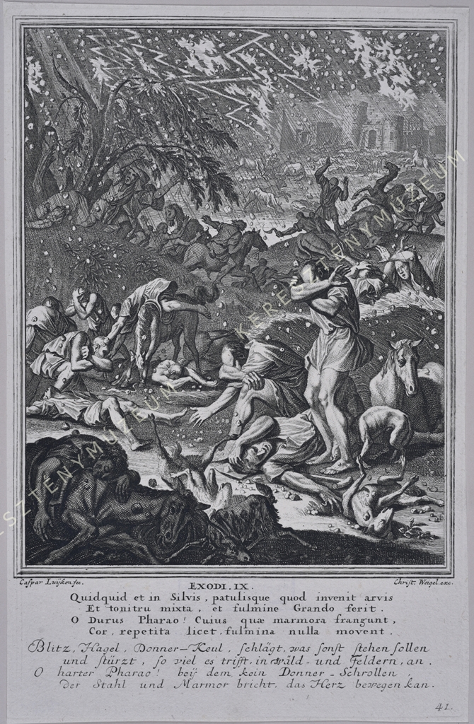 EXODI IX. Quidquid est in Silvis, patulisque quod invenit arvis / Et tonitru mixta, et fulmine Grando ferit. / O Durus Pharao! Cuius quae marmora frangunt / Cor, repetita licet, fulmina nulla movent. // Blitz, Hagel, Donner-Keul, schlägt, was sonst stehen sollen, / und stürzt, so vile es trifft in Wäld, und Feldern, an. / O harter Pharao! bey dem kein Donner-Schrollen / der Stahl und Marmor bricht, das Herz bewegen kan.