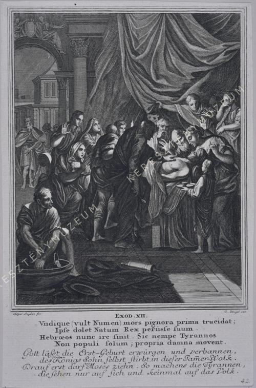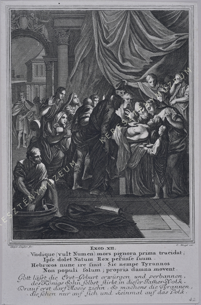 EXOD XII. Vndique (vult Numen) mors pignora prima trucidat; / Ipse dolet Natum Rex periisque suum. / Hebraeos nunc ire finit. Sic nempe Tyrannos / Non populi solum; propria damna movent. // Gott lässt die Erst-Geburt erwürgen und verbannen / des Königs Sohn selbst stirbt, in dieser Iam(m)er-Wolk. / Drauf erst darf Moses ziehn. So machens die Tyrannen, / die sehen nur auf sich und keinmal auf das Volk.