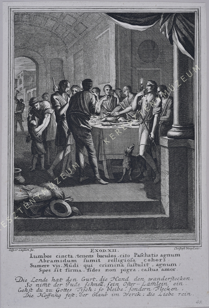 EXOD. XII. Lumbos cincta, tenens baculos, cito Paschatis agnum / Abramidum sumit relligiosa cohors. / Sumere vis. Mu(n)di qui crimina sustulit, agnum: / Spes sit firma, fides non pigra, castus amor. // Die Lende hat den Gurt, die Hand den Wanderstecken, / so nim(m)t der Iude schnell sein Oster-Läm(m)lein ein. / Gehst du zu Gottes Tisch: so bleibe, sondern Flecken, / Die Hoffnung fest, der Glaub im Werck; die Liebe rein.