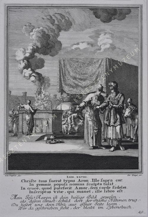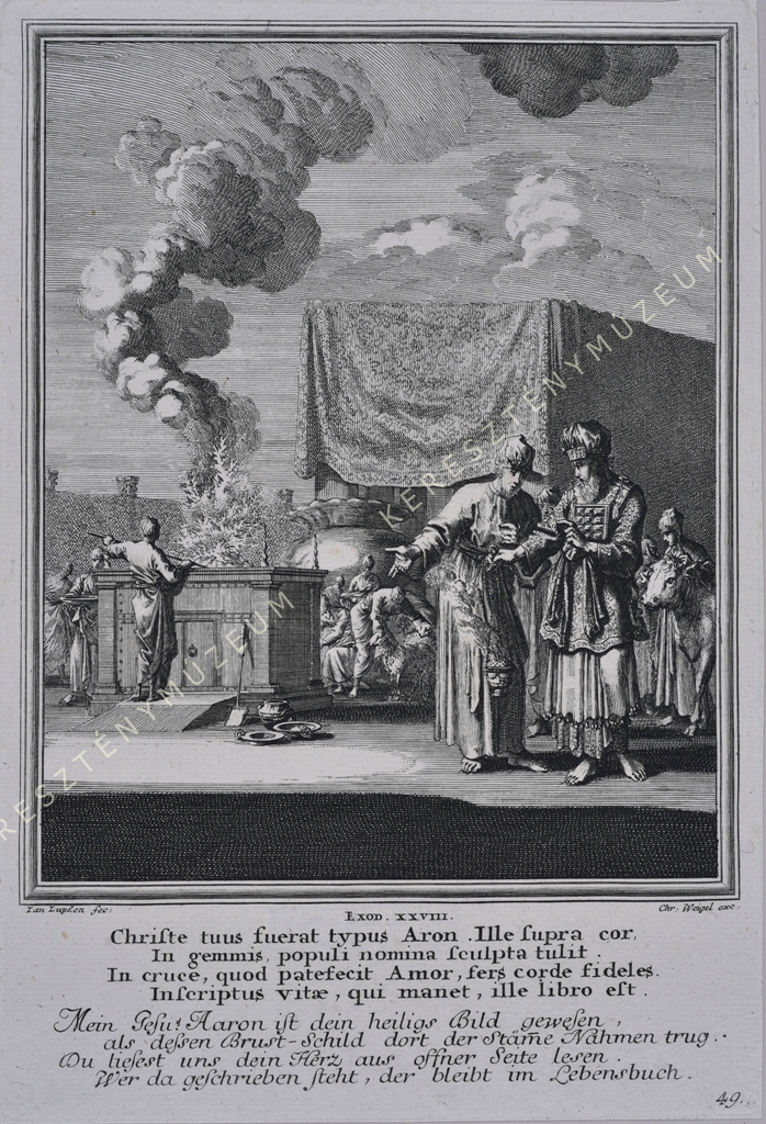 EXOD. XXVIII. Christe tuus fuerat typus Aron. Ille supra cor, / In gemmis, populi nomina sculpta tulit. / In cruce, quod patefecit Amor, fers corde fideles. / Inscriptus vitae, qui manet, ille libro est. // Mein Iesu! Aaron ist dein heiligs Bild gewesen, / als dessen Brust-Schild dort der Stäm(m)e Nahmen trug. / Du liesest uns dein Herz aus offner Seite lesen. / Wer da geschrieben steht, der bleibt im Lebensbuch.