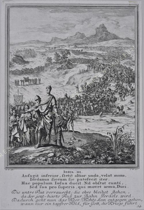 IOSUA III. Aufugit inferior, stetit altior unda, velut mons, / Iordanus siccum sic patefecit iter. / Hac populum Iosua ducit. Nil obstat eunti, / Sed sua pro superis, qui movet arma, Duci. // Die untre Flut verrauscht; die obre bleibet stehen, / da der jezt-harte Fluß zur Bahn Israels wird. / Dadurch geht nun das Heer: Nichts kan entgegen gehen, / wann nur ein tapfrer Held, für Gott, die Kriege führt.