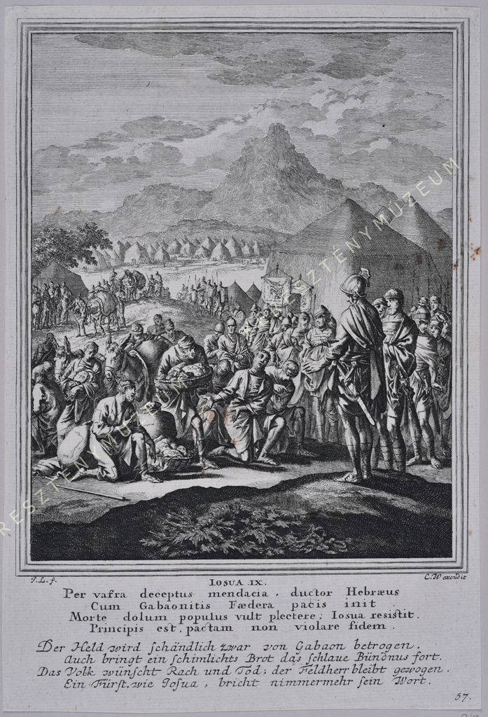 IOSUA IX. Per vafra deceptus mendacia, ductor Hebraeus, / Cum Gabaonitis Faedera pacis init / Morte dolum populus vult plectere; Iosua resistit. / Principis est, pactam non violare fidem. // Der Held wird schändlich zwar von Gabaon betrogen / auch bringt ein schimlichts Brot das schlaue Bündnus fort. / Das volk wünscht Rach und Tod: der Feldherr bleibt gewogen. / Ein Fürst, wie Iosua, bricht nimmermehr sein Wort.