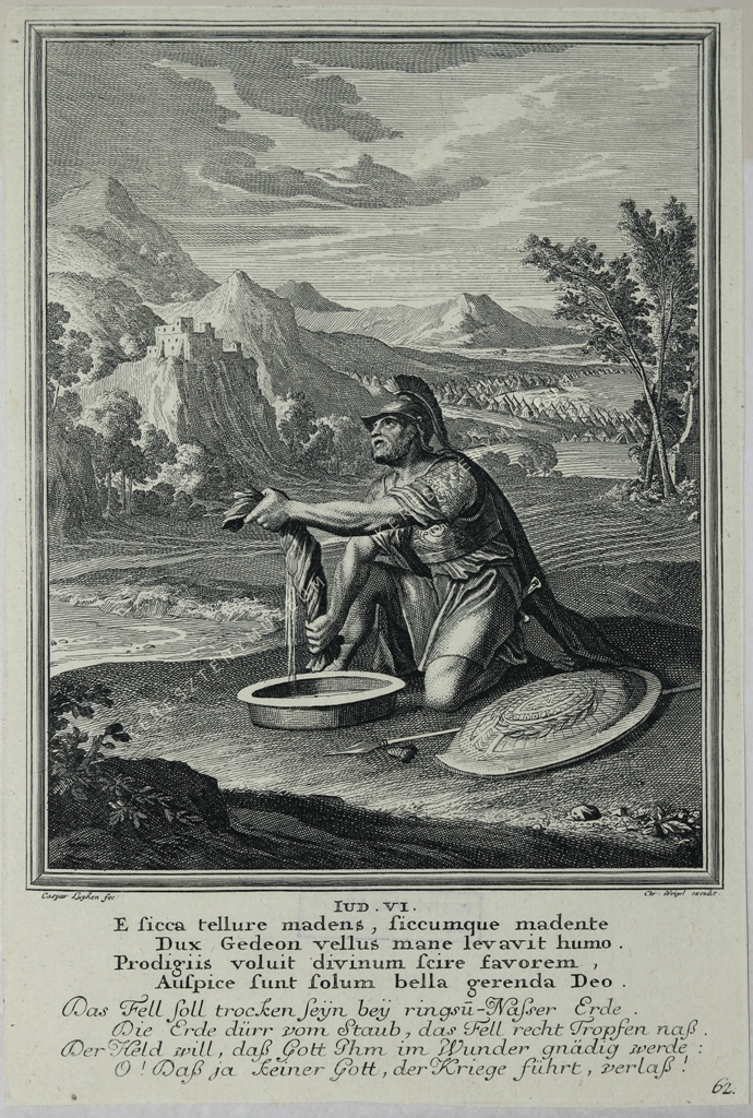 IUD. VI. E sicca tellure madens, siccumque madente / Dux Gedeon vellus mane levavit humo. / Prodigiis voluit divinum scire favorem, / Auspice sunt solum bella gerenda Deo. // Das Fell soll trocken seyn bey ringsu(m)-Nasser Erde. / Die Erde dürr vom Staub, das Fell recht Tropfen naß. / Der Held will, daß Gott Ihm im Wunder gnädig werde: / O! Daß ja keiner Gott, der Kriege führt, verlaß!