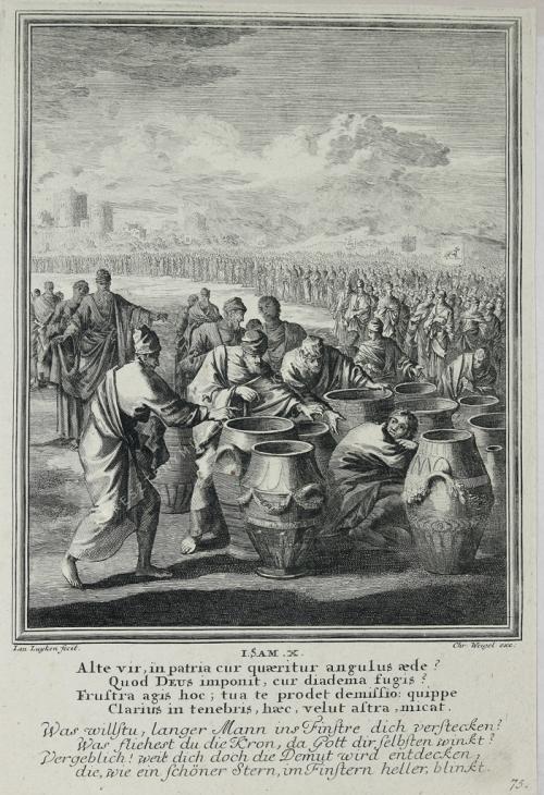 I. SAM. X. Alta vir, in patria cur quaeritur angulus aede? / Quod DEUS imponit, cur diadema fugis? / Frustra agis hoc; tua te prodet demissio: quippe / Clarius in tenebris, haec, velut astra, micat. // Was willstu, langer Mann ins Finstre dich verstecken? / Was fliehest du die Kron, da Gott dir selbsten winkt? / Vergeblich! weil dich doch die Demut wird entdecken, / die, wie ein schöner Stern, im Finster heller, blinkt.