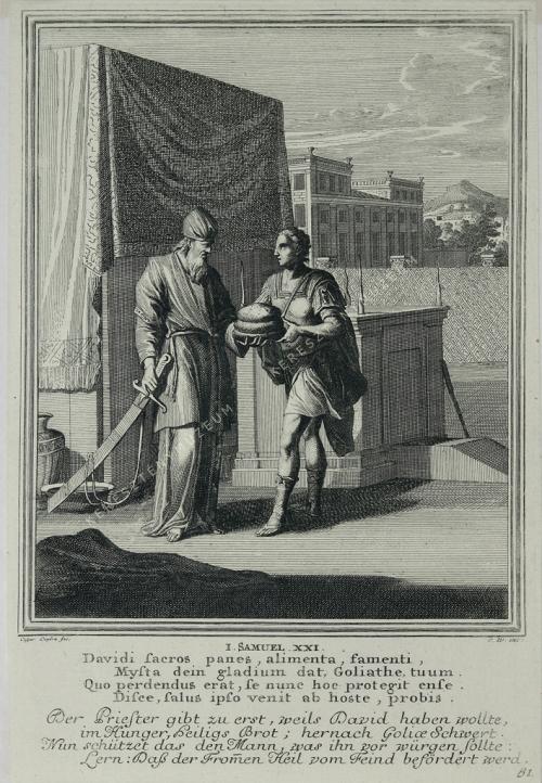 I. SAMUEL XXI. Davidi sacros panes, alimenta, famenti, / Mysta dein gladium dat, Goliathe, tuum. / Quo perdendus erat, se nunc hoc protegit ense. / Disce, salus ipso venit ab hoste, probis. // Der Priester gibt zu erst, weils David haben wollte, / im Hunger, heiligs Brot; hernach Goliae Schwert. / Nun schützet das den Mann, was ihn vor würgen sollte: / Lern: Daß der From(m)en Heil vom Feind befördert werd.