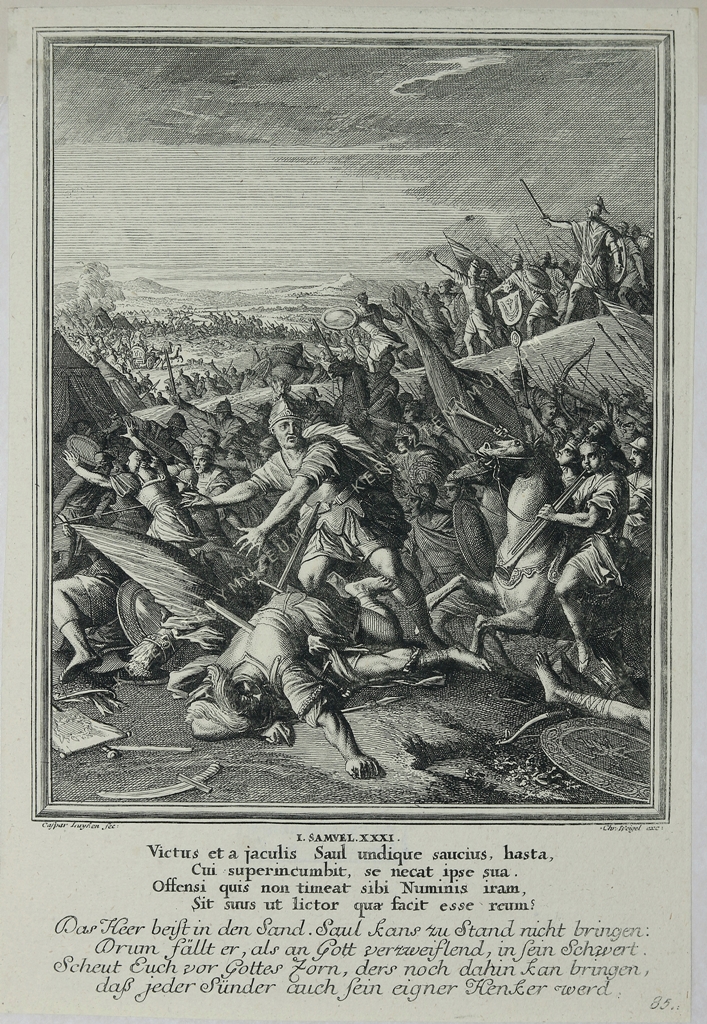 I. SAMUEL XXXI. Victus et a jaculis Saul undique saucius, hasta / Cui superincumbit, se necat ipse sua. / Offensi quis non timeat sibi Numinis iram, / Sit suus ut lictor qua facit esse reum? // Das Heer beist in den Sand. Saul kans zu Stand nicht bringen: / Drum fällt er, als an Gott verzweifelnd, in sein Schwert. / Scheut Euch vor Gottes Zorn, ders noch dahin kan bringen, / daß jeder Sünder auch sein eigner Henker werd.