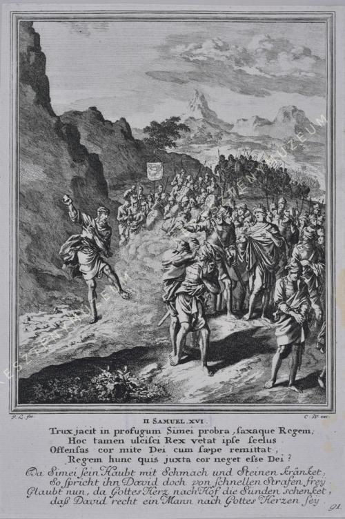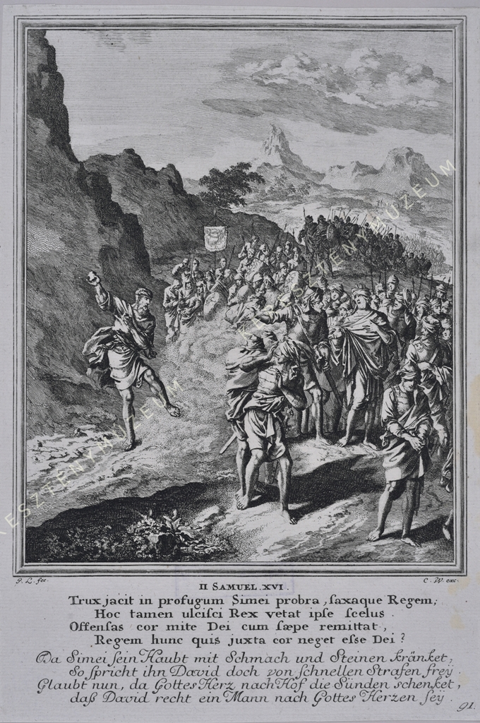 II. SAMVEL. XVI. Trux jacit in profugum Simei probra, saxaque Regem; / Hoc tamen ulcisci Rex vetat ipse scelus. / Offensas cor mite Dei cum saepe remittat, / Regem hunc quis juxta cor neget esse Dei? // Da Simei sein Haubt mit Schmach und Steinen kränket, / So spricht ihn David doch von schnellen Strafen frey. / Glaubt nun, da Gottes Herz nach Hof die Sünden schenket, / daß David recht ein Mann nach Gottes Herzen sey.