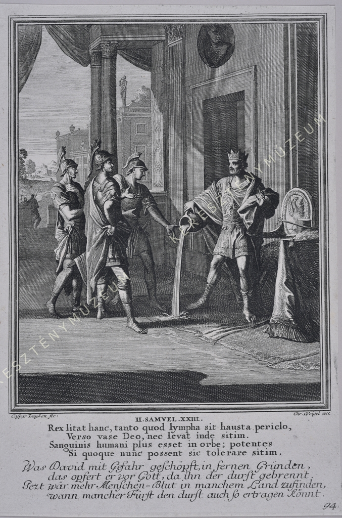 II. SAMVEL. XXIII. Rex litat hanc, tanto quod lympha sit hausta periclo, / Verso vase Deo, nec levat inde sitim. / Sanguinis humani plus esset in orbe; potentes / Si quoque nunc possent sic tolerare sitim. // Was David mit Gefahr geschöpft, in fernen Gründen, / das opfert er vor Gott, da ihn der Durst gebrennt. / Jetzt wär Mehr Menschen-Blut in manchem Land zufinden, / wann mancher Fürst den Durst auch so ertragen könt.