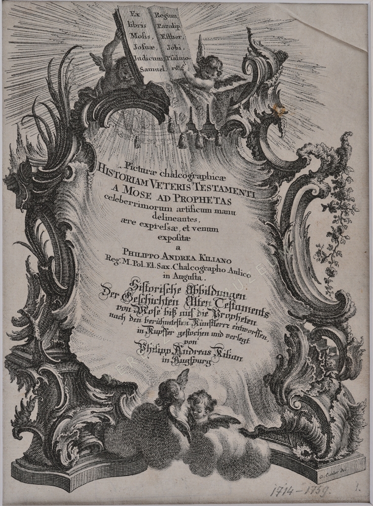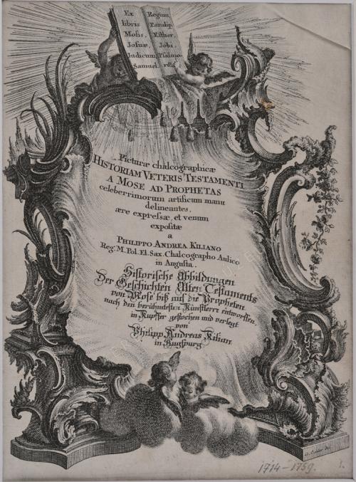 Picturae calchographicae Historiam Veteris Testamenti a Mose ad Prophetas celeberrimum artificum manu delineantes, aere expressae, et venum expolitae a Philippo Andrea Kiliano Reg. M. Pol. Et Sax. Chalcographo Aulica in Augusta. Historische Abbildungen Der Geschichten Alten Testaments von Mose biß auf die Propheten nach den berühmtesten Künstlern entworffen, in Kupffer gestochen und verlegt von Philipp Andreas Kilian in Augsburg.