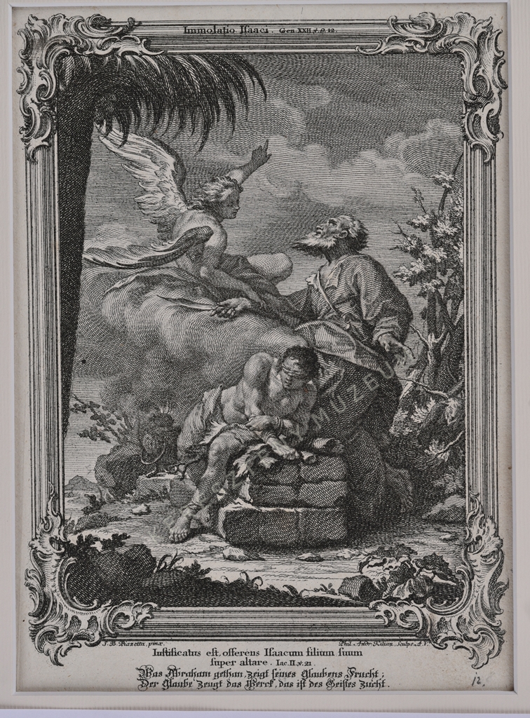 Immolatio Isaaci. Gen. XXII. V. 9.12.Iustificatus est, offerens Isaacum filium suum super altare. Iac. II. v. 21. Was Abraham gethan, zeigt seines Glaubens Frucht: Der Glaube zeugt das Werck, das ist des Geistes zucht.