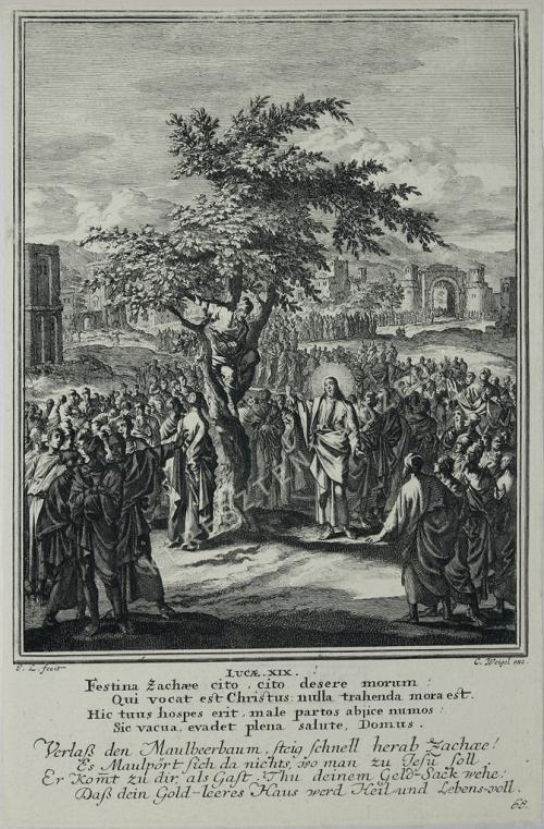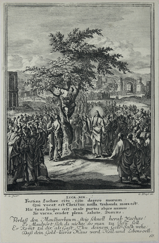 LUCAE XIX. Festina Zachae cito, cito desere morum: / Qui vocat est Christus: nulla trahenda mora est. / Hic tuus hospes erit, male partos abjice numos: / Sic vacua, evadet plena salute, Domus. // Verlaß den Maulbeerbaum, steig schnell herab, Zachaee! / Es Maulpört sich da nichts, wo man zu Iesu soll. / Er kom(m)t zu dir, als Gast. Thu deinem Geld-Sack wehe! / Daß dein Gold-leeres Haus werd Heil und Lebens-voll.