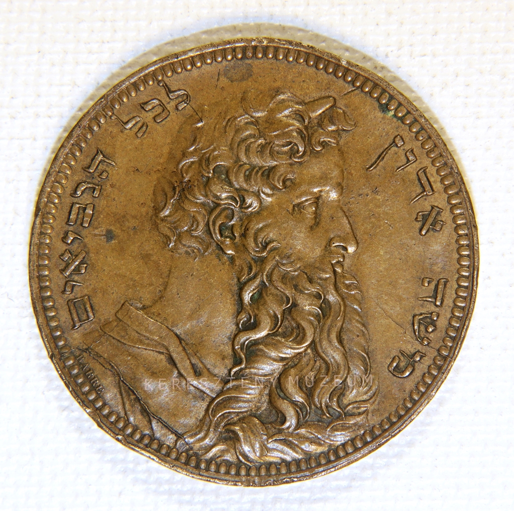Mózes ábrázolása profilból, héber körirattal. (körirat fordítása:"A próféták mestere")