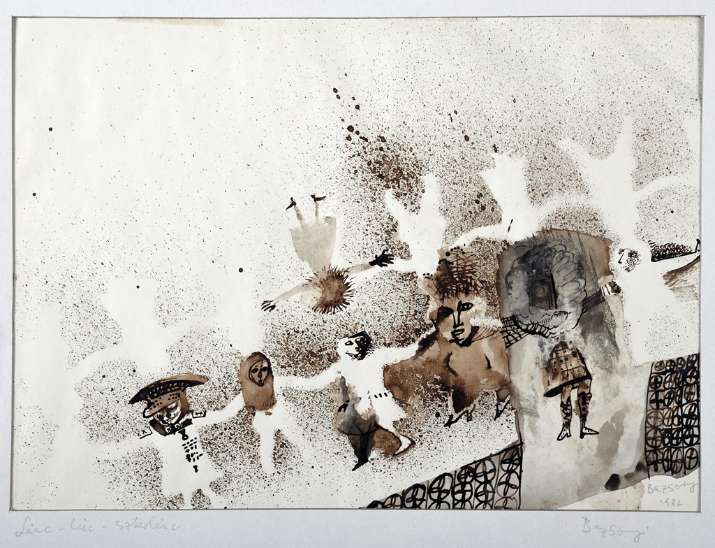 Kerítés mögött körtáncot járó alakok (néhol csak fehér lenyomat formájában).