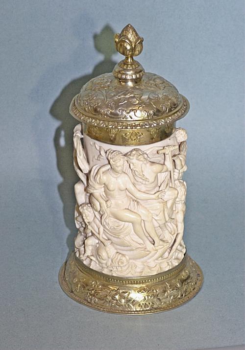 Fedelén, a befoglaló alsó, és felső gyűrűn, öntött-cizellált virágmotívumok. Dúsan faragott, elefántcsont test, mozgalmas mitológiai jelenetet mutat be.
