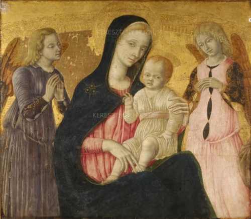 Ez a felül kiegészített, eredetileg ívesen záródó kép egy lunetta középső töredéke volt, amely egykor a sienai Sant’Agostino templom Betlehemi gyermekgyilkosság-oltárát koronázta. A kompozíció két szélét egykor a Madonna felé forduló két imádkozó férfiszent, balról Szent Ágoston, jobbról Assisi Szent Ferenc töltötte ki (az utóbbi szent barna csuhájának töredéke még látható a kép jobb szélén). Az esztergomi képen az enyhe felülnézetben láttatott, légies szépségű, halovány bőrű alakok ragyogó aranyháttér előtt jelennek meg. A visszafogott színvilágú, finoman modellált nagy felületeket különös gonddal megfestett dekoratív részletek élénkítik, mint a Mária vállát díszítő hármascsillag-motívum, a csillogó angyalszárnyak, a gazdag brokátmintás, hasított ruhaujjak, vagy az aprólékosan ábrázolt hajfürtök. Az oltár Betlehemi gyermekgyilkosságot ábrázoló középképe ma a sienai városháza kiállításán látható. Az alján olvasható, a készítés évét is tartalmazó felirat megnevezi a festőt, aki a 15. század második felének elismert, sokat foglalkoztatott sienai mestere volt.