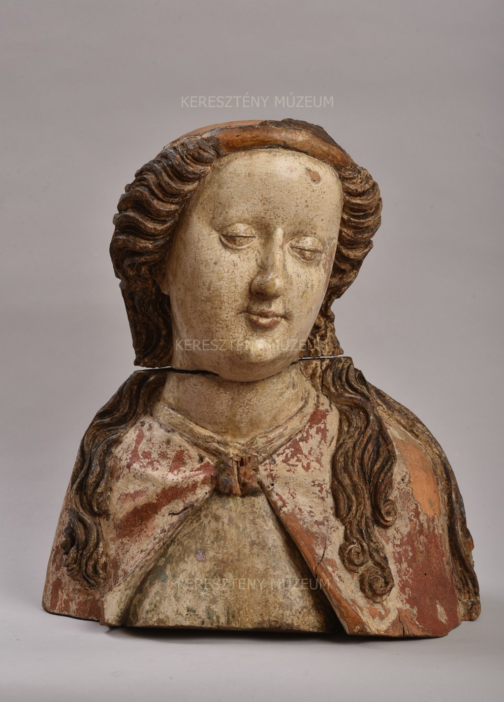 Az eredetileg feltehetőleg egészalakos szobrot valószínűleg az első világháború alatt fűrészelték szét több darabra, a fennmaradt mellrészt és fejet - ma is jól látható módon - a nyaknál illesztették össze. Színezése erősen kopott, a fa hordozóra, az alapozás alá ragasztott vászon több helyen látszik. A szobrot a Szépművészeti Múzeumba jutott párdarabjával együtt (ltsz. 7176) egyes kutatók Kassai Jakab műhelyével hozzák összefüggésbe, mások szerint azonban Hans Multscher műhelyének hatása alatt készült.