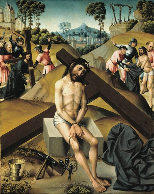 Krisztus passiójának az evangéliumokban nem szereplő epizódját látjuk, melyet elsősorban a Németalföldön ábrázoltak a 15. században, különösen a szobrászatban terjedt el. A megkötözött kezű, ruháitól már megfosztott Jézust látjuk a keresztrefeszítés előtti pillanatokban. Egy hatalmas, faragott kőtömbön ül, előtte a passió „eszközei” (arma Christi). Ő maga pedig mintha a közelgő halálról meditálna, bennünket is meditációra invitálva. Ezt az epizódot a kor embere a későközépkor passió-elbeszélésekben olvashatta. A kép hátterében a két megelőző momentum elbeszélése látható, a Keresztvitel gyakran ábrázolt narratívája és a ritkábban ábrázolt apokrif eredetű jelenet, a Krisztust megfosztják ruháitól. A festményt korábban német munkának vélte a kutatás, a restaurálás azonban felszínre hozta a korai holland festészet világos színvilágát, a levegős táj atmoszféráját és a rusztikus, paraszti figurákat. Krisztus arca egyébként hasonlóságot mutat Dirk Bouts művészetével. Bouts az Észak-Németalföldről vándorolt Leuvenbe.