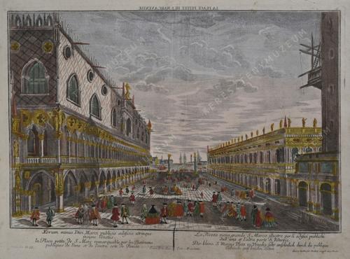 A kép alatt: Forum minus Divi Marci publicis aedificiis utrinque / insigne Venetiis. // La Place petite de S. Marc remarquable par les Batimens / publiques de l'une et de l'autre cote de Venise. // La Piazza meno grande S. Marco illustre per li edifici publichi / dall'una et l'altra parte di Venezia. // Der kleine S. Marcus Platz zu Venedig, sehr ansehnlich durch die publique / Gebäude auf beiden Seiten.