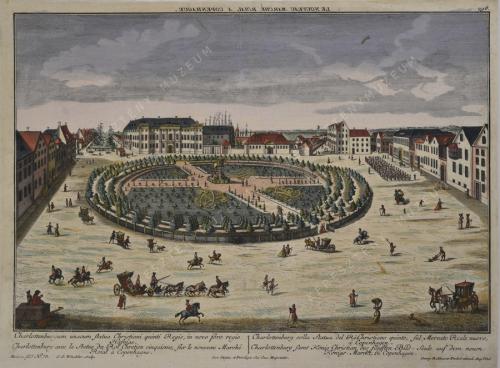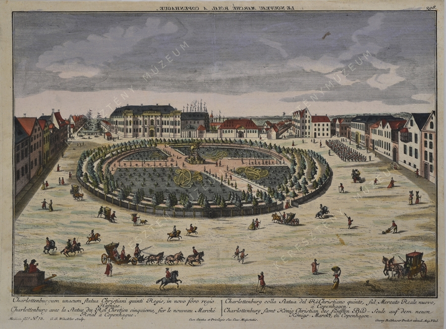 Charlottenburgum unacum statua Christiani quinti Regis, in novo foro regio / Hafniae. // Charlottenburg avec la statue du Roi Chretien cinquieme, sur le nouveau Marché / Roial à Copehague. // Charlottenburg colla Statua del Rè Christiano quinto, sul Mercato Reale nuovo / à Copenhagen. // Charlottenburg samt König Christian des fünfften Bild-seule auf dem neuen / Königs-Marckt, zu Copenhagen.