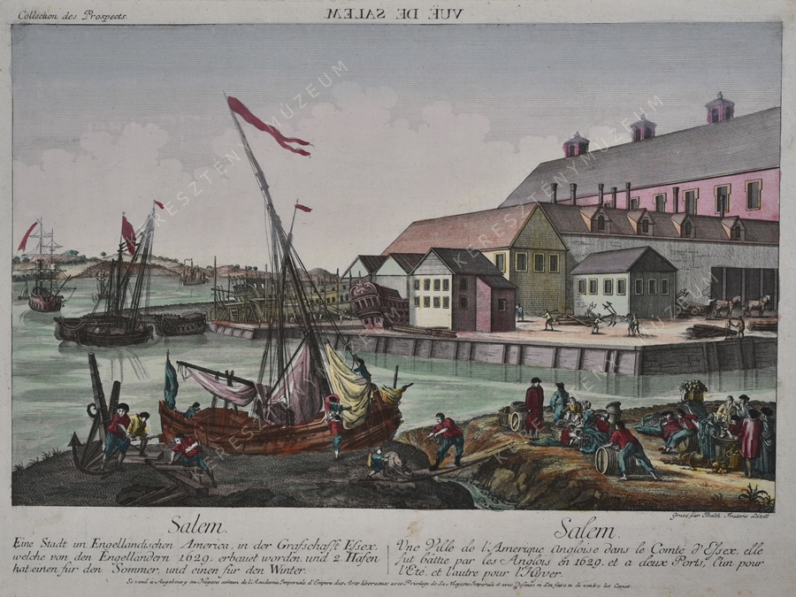 Salem / Eine Stadt im Engelländischen America, inder Grafschafft Essex, / welche von den Engelländern 1629 erbauet worden, und 2 Häfen / hat, einen für den Sommer, und einen für den Winter. // Salem. / Une Ville de l'Amerique angloise dans le Comté d'Essex, / ell fut bâttie par les Anglois en 1629. et a deux Ports, l'un pour / l'Eté, et l'autre pour l'Hyver.