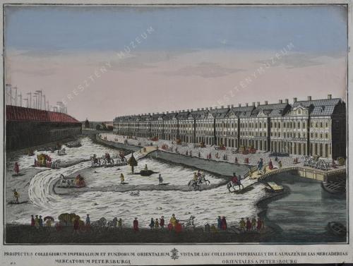 PROSPECTUM COLLEGIORUM IMPERIALIUM ET FUNDORUM ORIENTALIUM MERCATORUM PETERSBURGI // VISTA DE LOS COLLEGIOS IMPERIALES, Y DE L'ALMAZÉN DE LAS MERCADERIAS ORIENTALES A PETERSBOURG