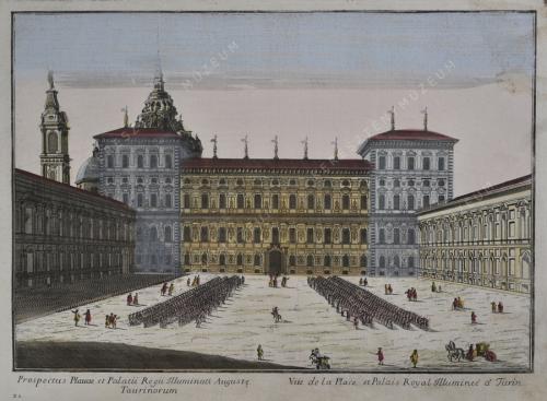 Prospectus Plateae et Palatii Regii Illuminati Augustae / Taurinorum. // Vüe de la Place, et Palais Royal Illuminée a Turin.