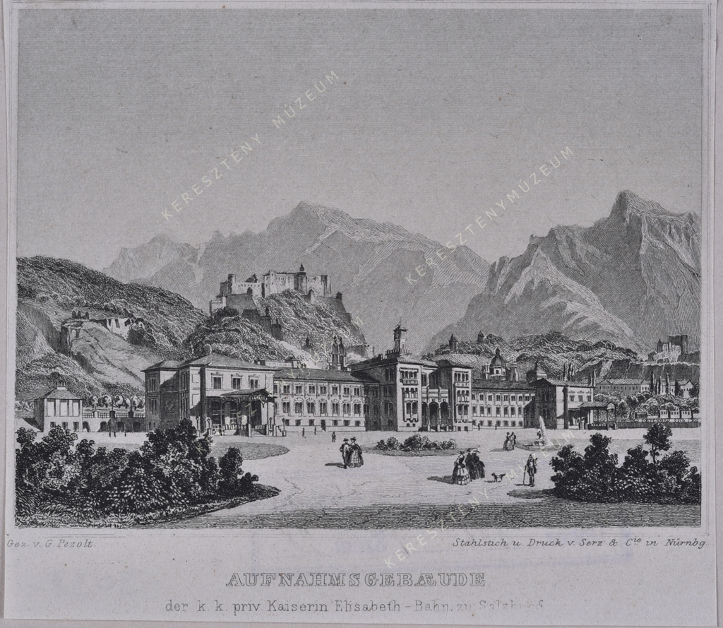 Serz, Gottlieb Andreas (Nürnberg 1810 - (metszet)) Pezolt, Georg (Salzburg, 1810 - 1878) (rajz) A salzburgi pályaudvar