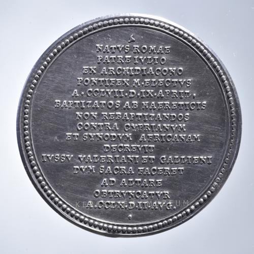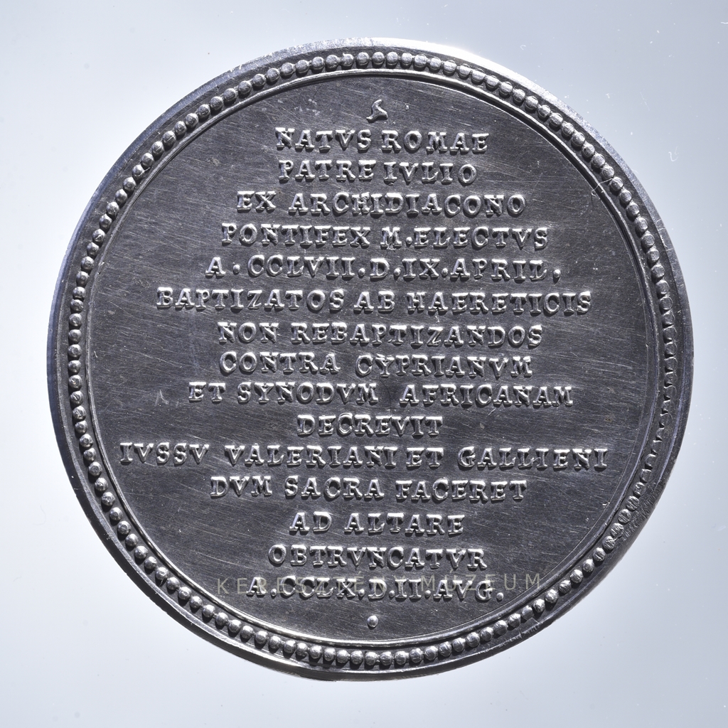 NATVS ROMAE PATRE IVLIO EX ARCHIDIACONO PONTIFEX M*ELECTVS*A*CCLVII*D*IX*APRIL*BAPTIZATOS AB HAERETICIS NON REBAPTIZANDOS CONTRA CYPRIANVM ET SYNODVM AFRICANAM DECREVIT IVSSV VALERIANI ET GALLIENI DVM SACRA FACERET AD ALTARE OBTRVNCATVR A.CCLX.D.II.AVG.*