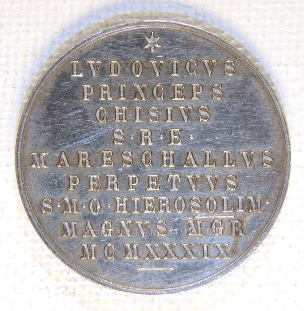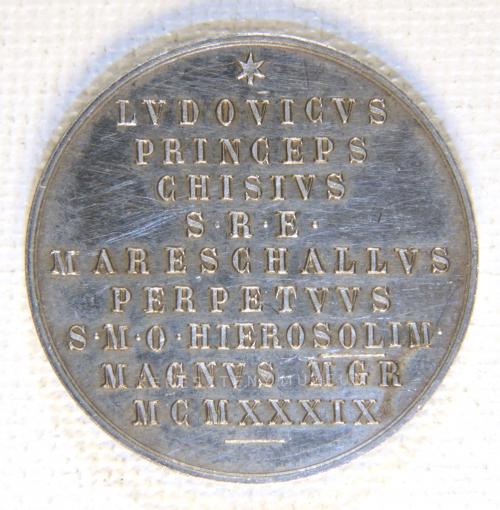felirat: LVDOVICVS / PRINCEPS /CHISIVS / S.R.E. / MARESCHALLVS / PERPETVVS / S.M.O. HIEROSOLIM. / MAGNVS MGR MCMXXXIX (Ludovico Chigi herceg, a konklávé marsallja)