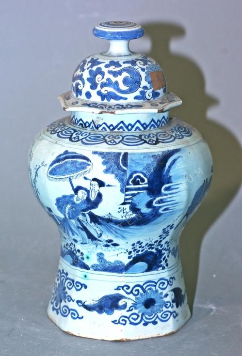 Máz alatti kék festéssel készült "chinoiserie" minták használatával. Erősen elnagyolt kínaizáló jelenetek váltakoznak a körte alakú edényen. Mind a nemesasszony fölé napernyőt tartó, hivatalnoki jelvényekkel ábrázolt férfi, mind a guzheng játékot (kínai pengetős, citera-szerű hangszer)imitáló zenész nem hiteles ábrázolás, csak az eredeti kínai porcelán-áruk díszítményeinek utánzása.